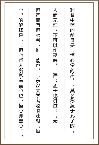 利君中藥具有近400年的悠久歷史。公司前身“恒心堂藥莊”始創(chuàng)于明朝末期,興盛于清代、民國,其招牌產(chǎn)品“坎壢妙濟(jì) 丹”、“參茸固本還少丹”功能獨特、療效神奇,享譽廣大西部地區(qū),有“神農(nóng)妙濟(jì)”之美譽,歷代名人左宗棠、于佑任、 屈武等都留有書聯(lián)贊譽。民國時期,“恒心堂”在西北5省及山西、四川、云南均設(shè)有分號,坐大西部藥界,同北京“同仁 堂”、浙江“胡慶余堂”、廣州“陳李記”一起,被稱為“四大藥莊”,是國內(nèi)為數(shù)不多的幾家具有數(shù)百年歷史的中藥“老 字號”之一。